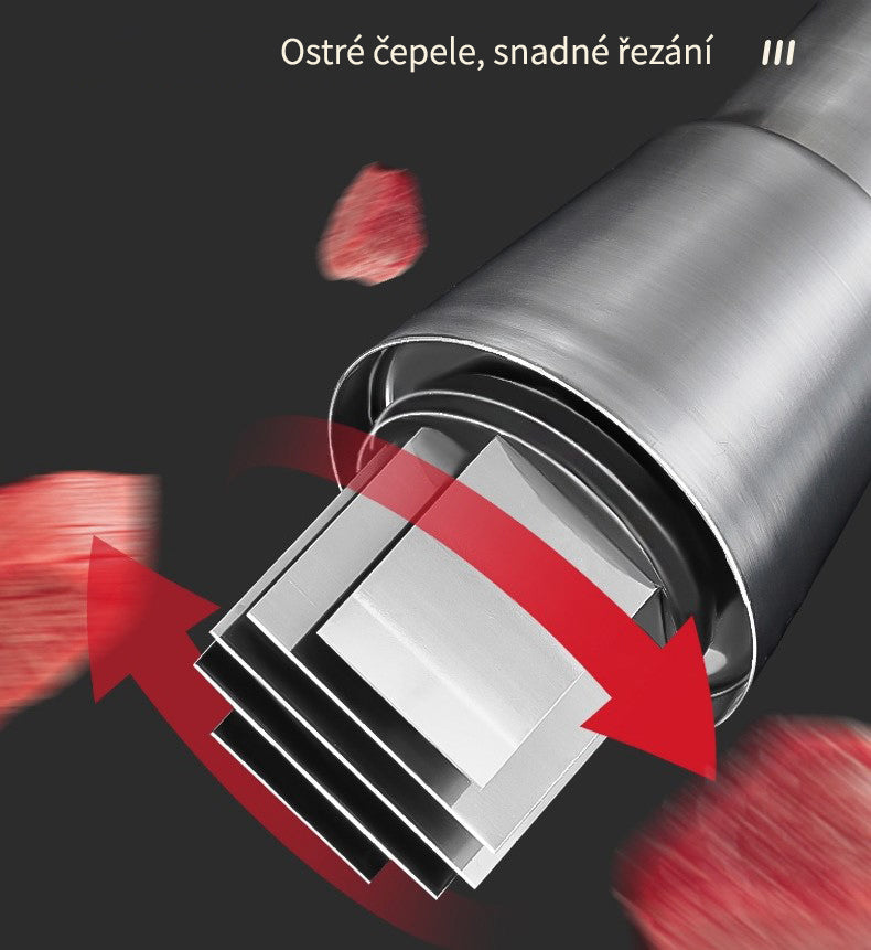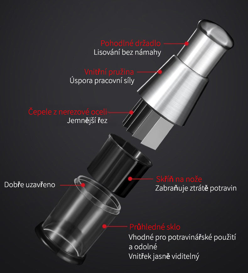Materiál: Transparentní PP miska, nerezové nože a lis, ABS zajišťovač nožů